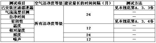 最長測試時(shí)間間隔是根據(jù)近年來我國一些合資企業(yè)的內(nèi)部質(zhì)量管理?xiàng)l款以及ISO 14644-2的空氣潔凈度認(rèn)證測試要求而編制的。