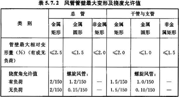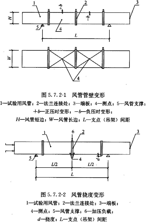 10 外購(gòu)成品風(fēng)管應(yīng)有變形試驗(yàn)。風(fēng)管管壁最大變形相對(duì)量(表面最大不平度b與風(fēng)管短邊長(zhǎng)度H之比,圖5.7.2—1)及撓度角允許值[兩段風(fēng)管組合件中央連接法蘭部位的撓度量d與該兩風(fēng)管組合的兩吊架(支點(diǎn))間距一半L/2之比,見圖5.7.2—2]應(yīng)符合表5.7.2的規(guī)定。