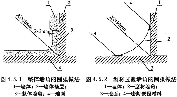 4.5.2 當(dāng)?shù)孛媾c墻面的夾角用R不小于30mm的型材過渡形成圓角時,突出墻面、地面的兩端處應(yīng)用彈性材料逐漸過渡并嵌固密封。經(jīng)常用液體處理地面和墻面的潔凈室不宜采用此種形式(圖4.5.2)。