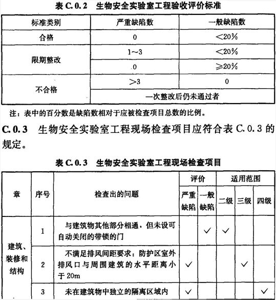 C.0.2 生物安全實(shí)驗(yàn)室工程驗(yàn)收評價(jià)標(biāo)準(zhǔn)應(yīng)符合表C.0.2的規(guī)定。
