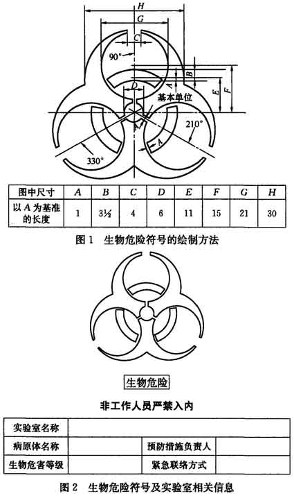 4.2.8 二級、三級、四級生物安全實驗室的操作對象都不同程度地對人員和環(huán)境有危害性,因此根據(jù)國際相關標準,生物安全實驗室入口處必須明確標示出國際通用生物危險符號。生物危險符號可參照圖1繪制。在生物危險符號的下方應同時標明實驗室名稱、預防措施負責人、緊急聯(lián)絡方式等有關信息,可參照圖2。