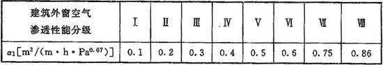 式中:α1——外門窗縫隙滲風(fēng)系數(shù)[m3/(m·h·pab)],當(dāng)無實(shí)測數(shù)據(jù)時(shí),可根據(jù)建筑外窗空氣滲透性能分級的相關(guān)標(biāo)準(zhǔn),按表F.0.3采用;