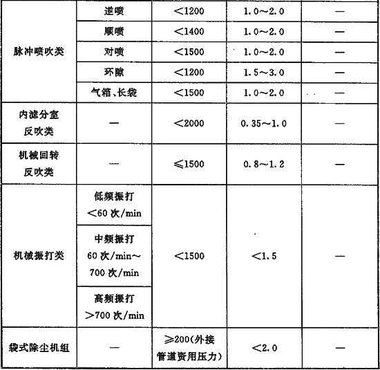 2 袋式除塵器的運(yùn)行阻力宜為1200Pa~2000Pa,初阻力接近下限值,終阻力接近上限值。