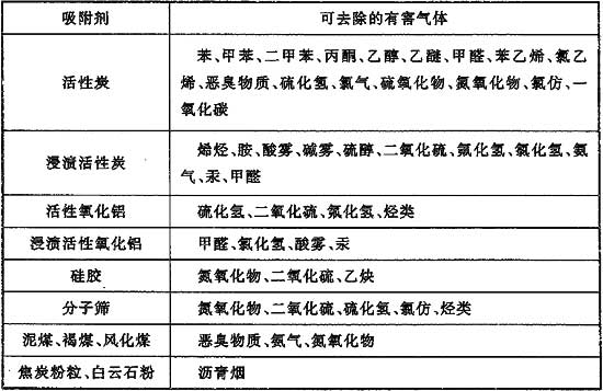 常用的吸附劑有活性炭、硅膠、活性氧化鋁或分子篩等?;钚蕴渴菓?yīng)用較廣泛的一種吸附劑,特別是經(jīng)浸漬處理后,應(yīng)用更加廣泛。硅膠等吸附劑稱為親水性吸附劑,用于吸附水蒸氣和氣體干燥。各種吸附劑可去除的有害氣體見(jiàn)表6。