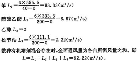 算例:某車間使用脫漆劑,每小時(shí)消耗量為4kg。脫漆劑成分為苯50%,醋酸乙酯30%,乙醇10%,松節(jié)油10%,求全面通風(fēng)所需的空氣量。