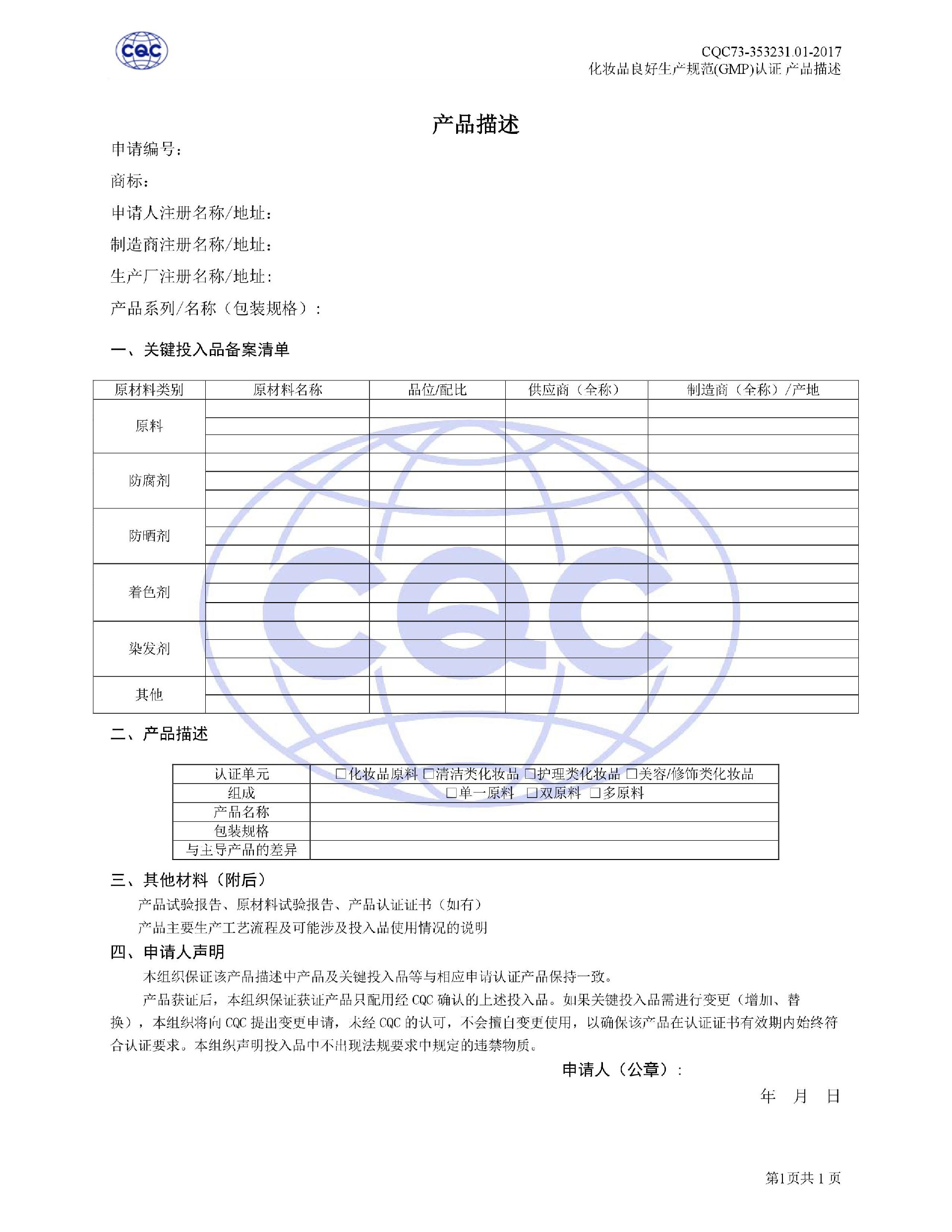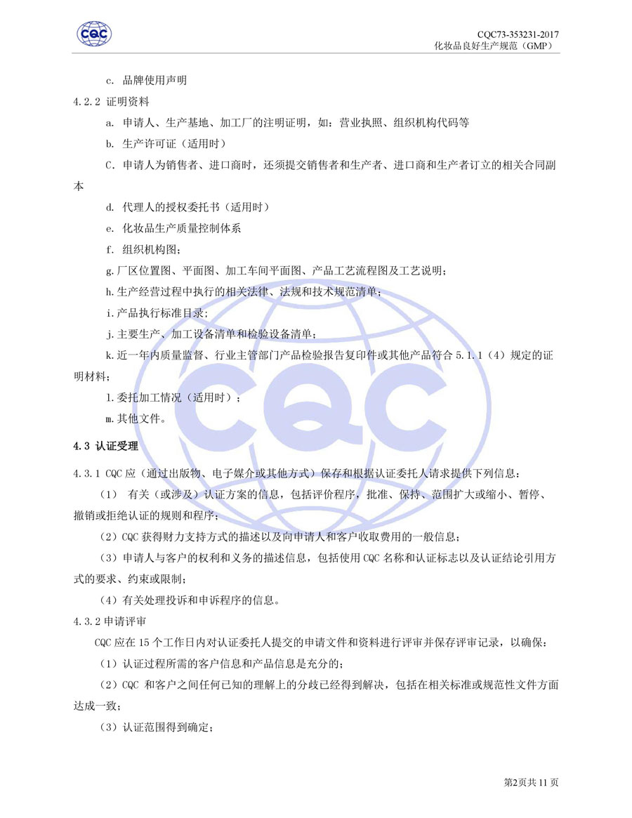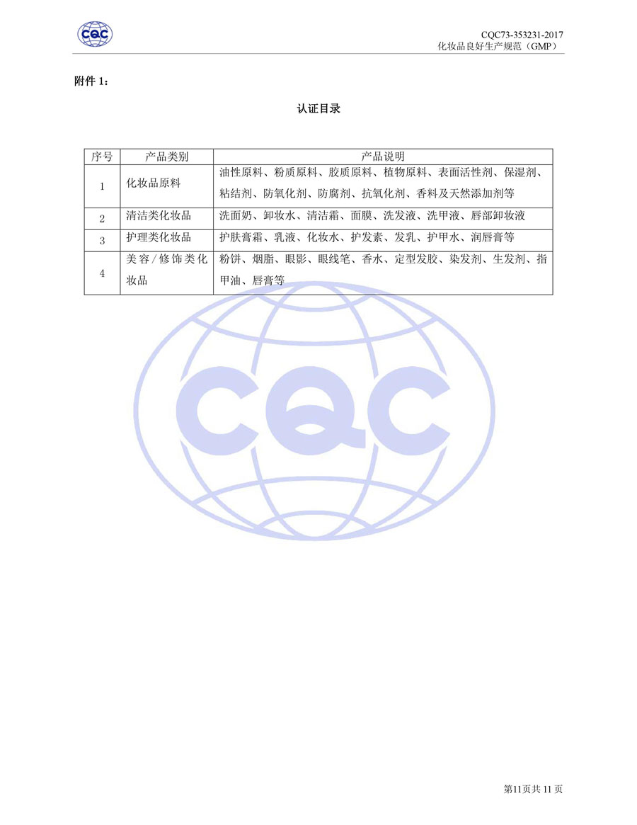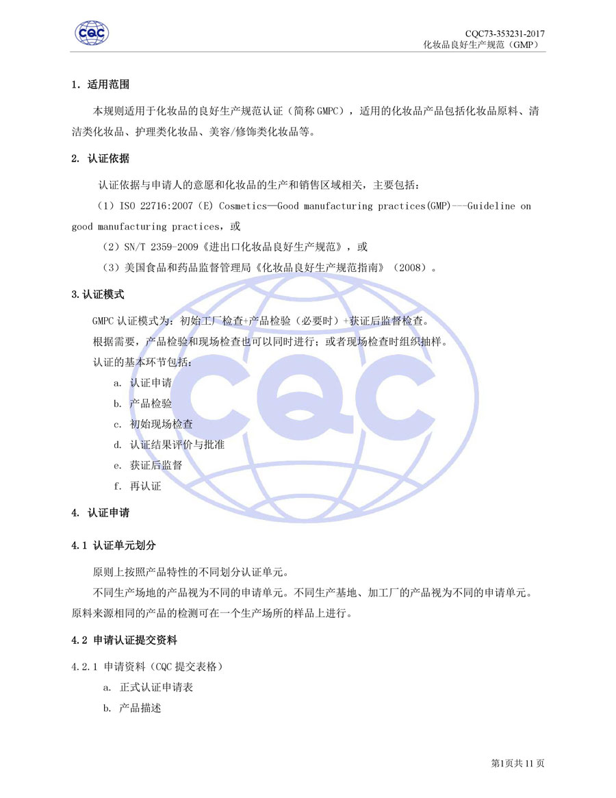 認證依據(jù)為美國農(nóng)業(yè)部《Cosmetic Good Manufacturing Practice Guideline》, European Federation for Cosmetic Ingredients (EFfIC)-GMP for cosmetic ingredient,ISO 22716-2007《化妝品良好生產(chǎn)規(guī)范》、CQC73-353231-2016《化妝品認證實施規(guī)則》及適用的法律法規(guī)等。