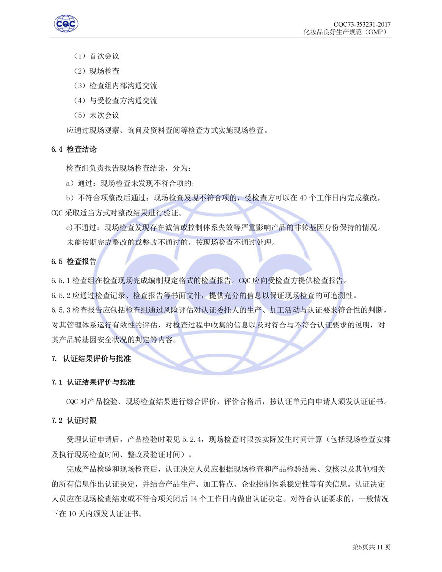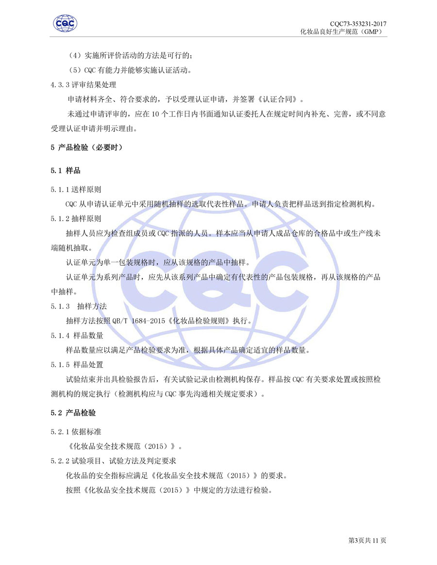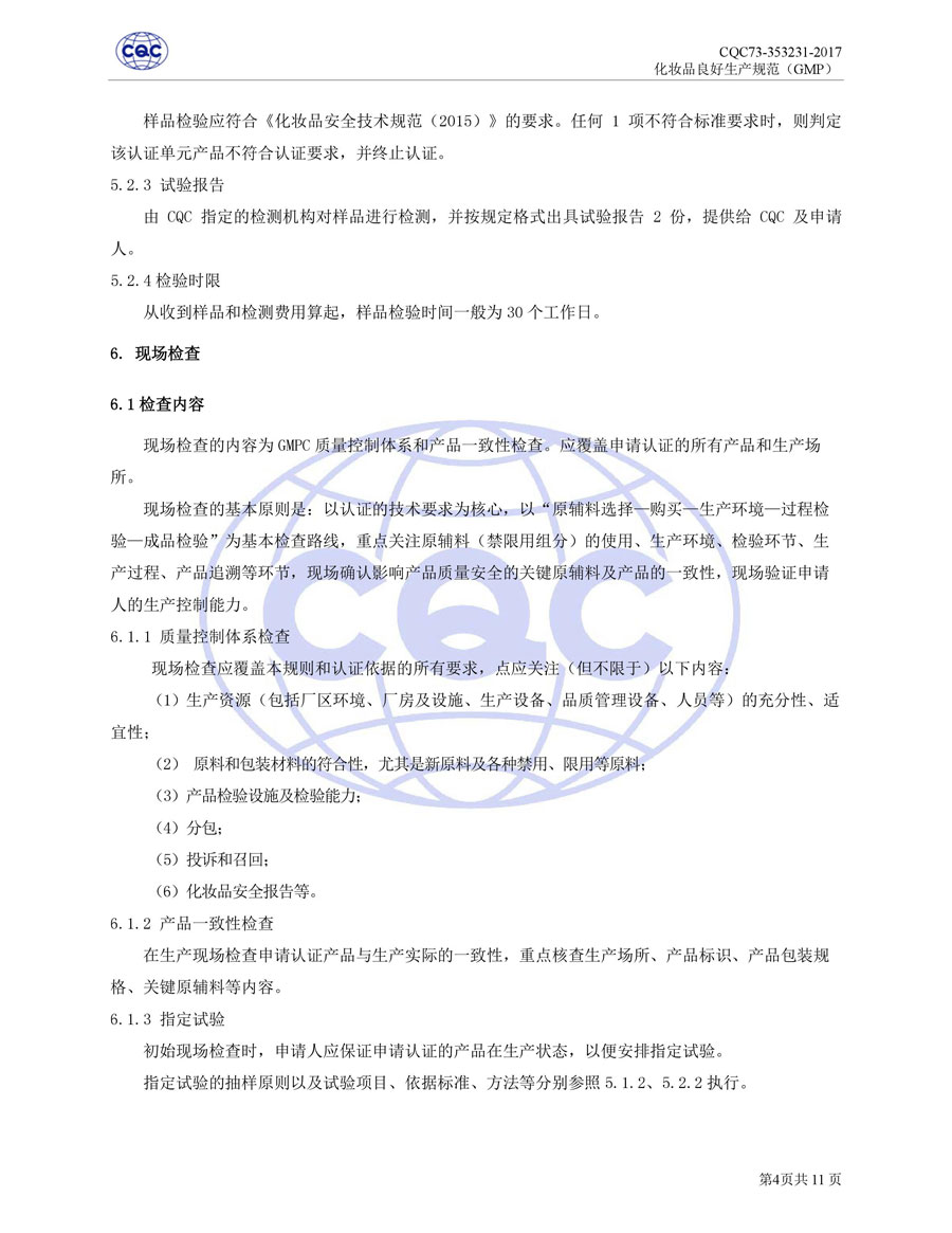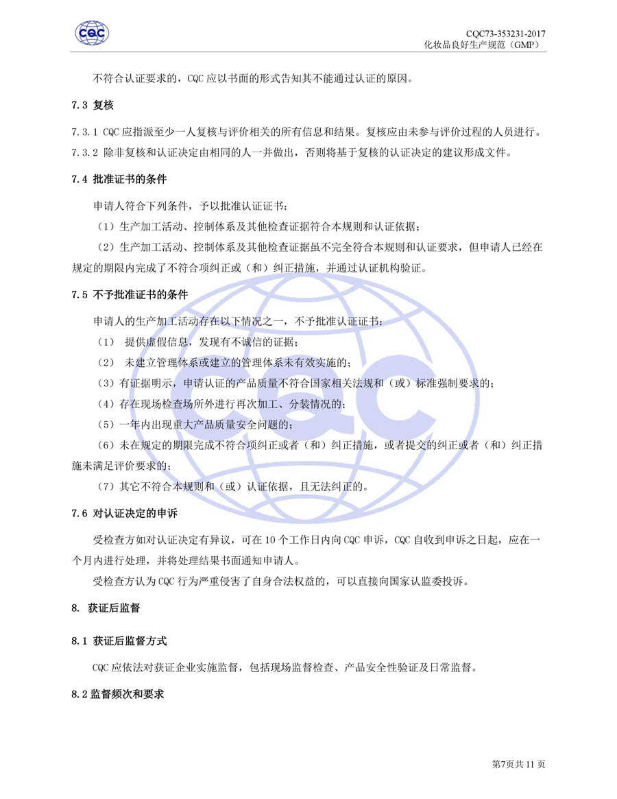 認證依據(jù)為美國農(nóng)業(yè)部《Cosmetic Good Manufacturing Practice Guideline》, European Federation for Cosmetic Ingredients (EFfIC)-GMP for cosmetic ingredient,ISO 22716-2007《化妝品良好生產(chǎn)規(guī)范》、CQC73-353231-2016《化妝品認證實施規(guī)則》及適用的法律法規(guī)等。